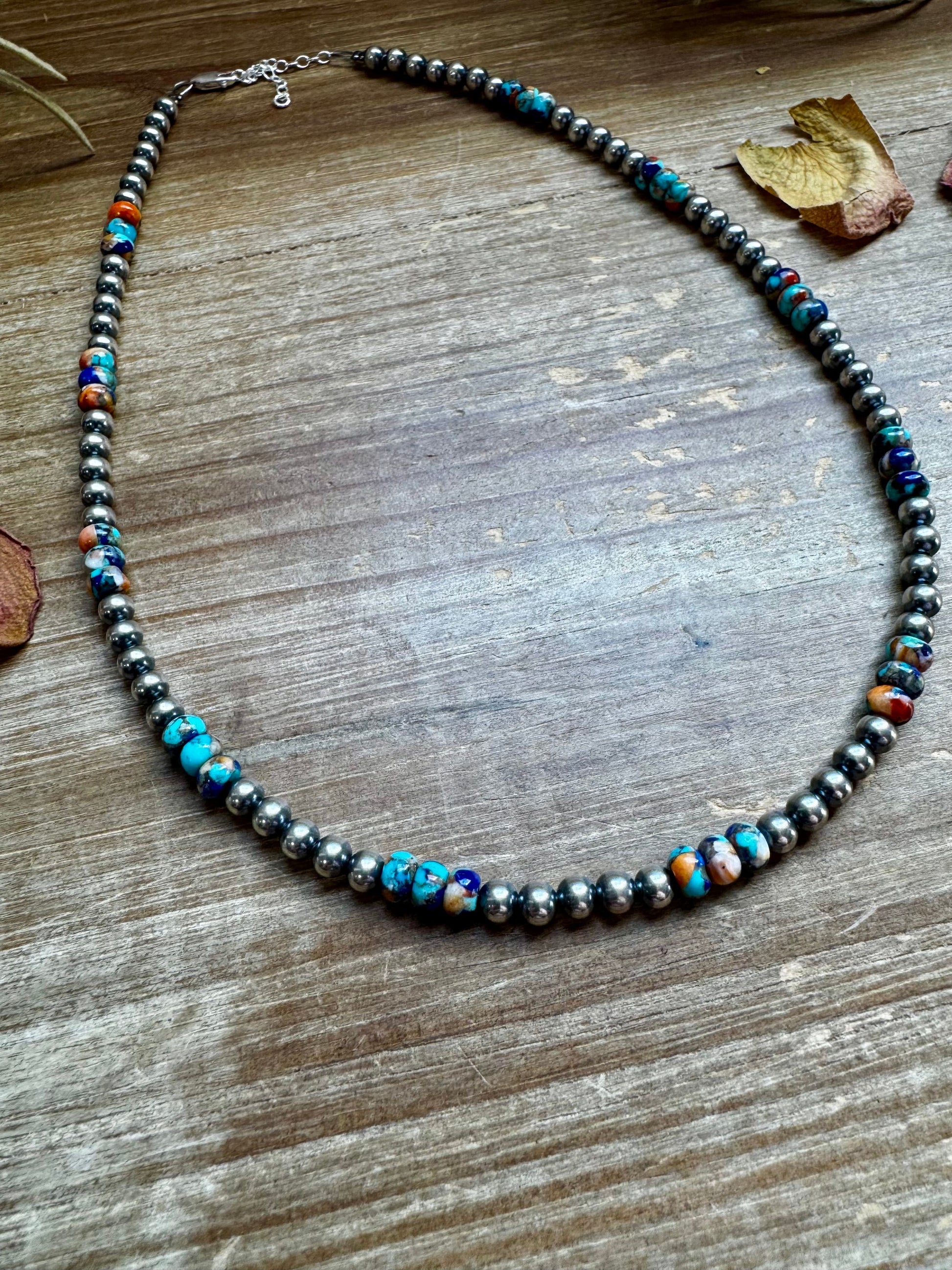 18 Inch 5 mm sterling silver pearls necklace with RARE Lapis mix with spiny & turquoise rondelle beads