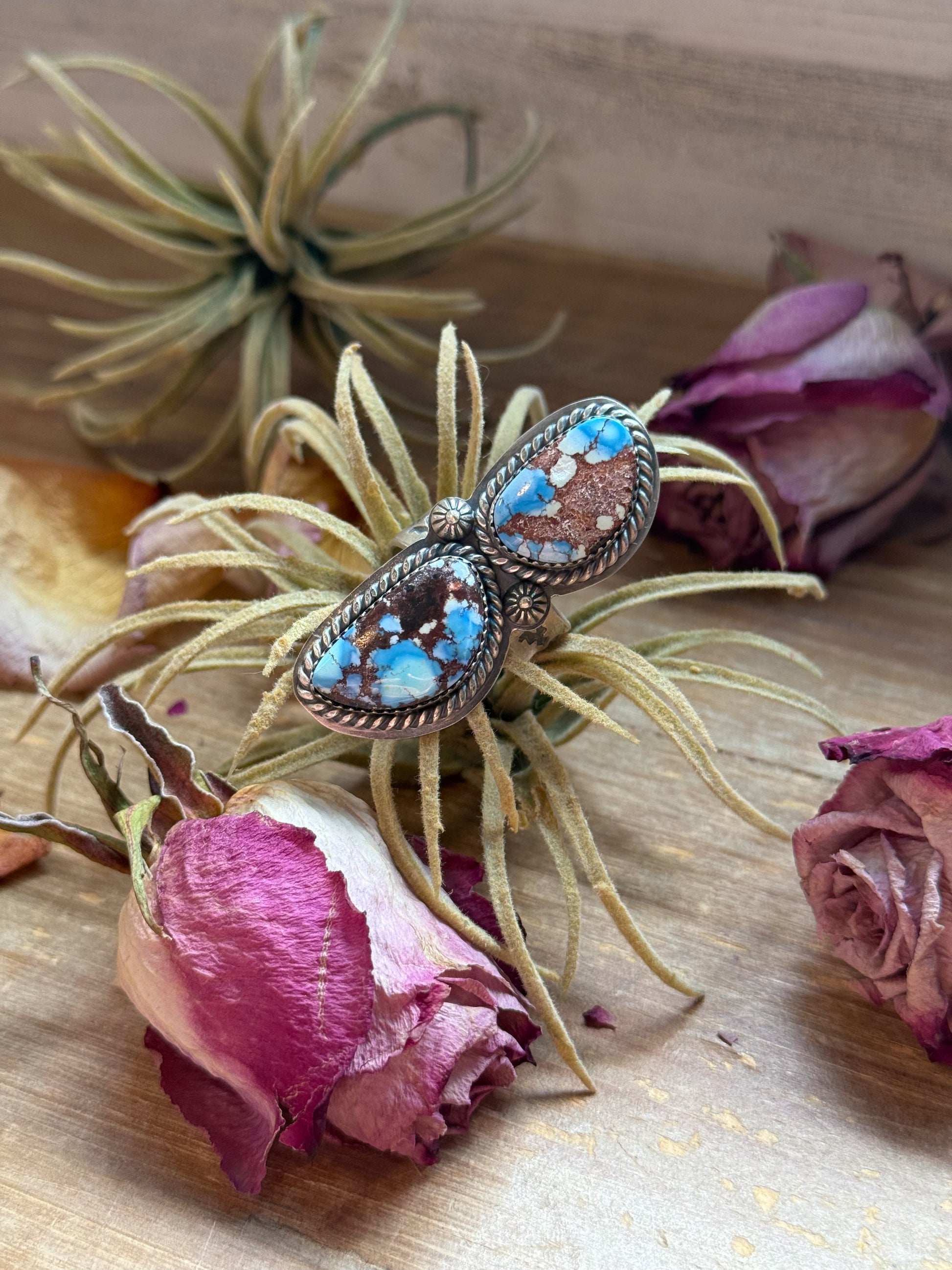 Handmade in New Mexico, USA, this 2-stone Golden Hills turquoise ring captures the rare lilac-blue tones that make this gemstone so distinctive. Set in solid sterling silver, each stone is unique in its matrix and hue, creating a natural harmony of color and texture.