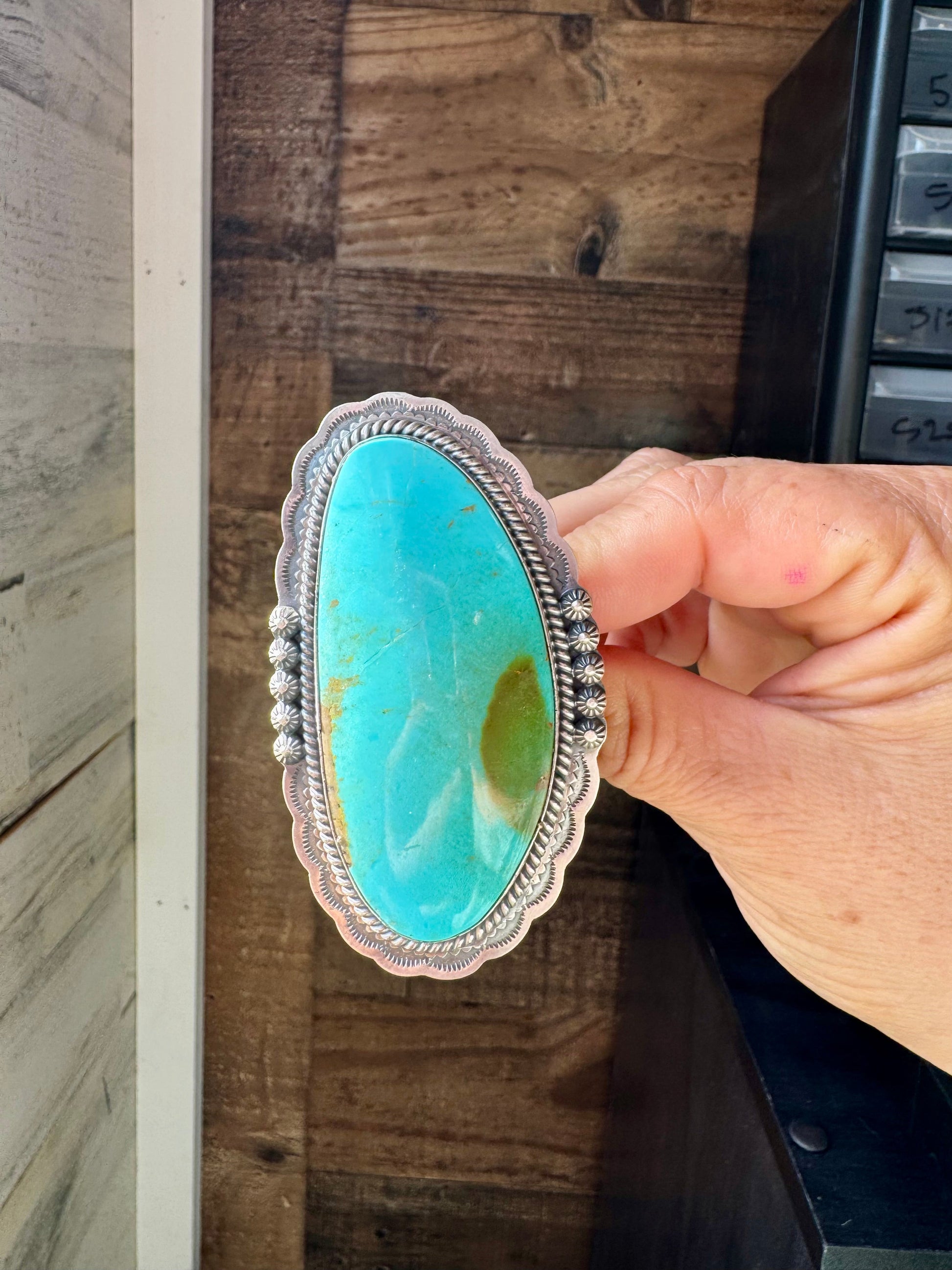 This stunning one-of-a-kind statement ring features a large piece of Sonoran Gold turquoise set in sterling silver with bold craftsmanship. Handmade by Navajo artist Gilbert Platero and stamped "GP" on the back, this piece is a showstopper with its rich color and size.