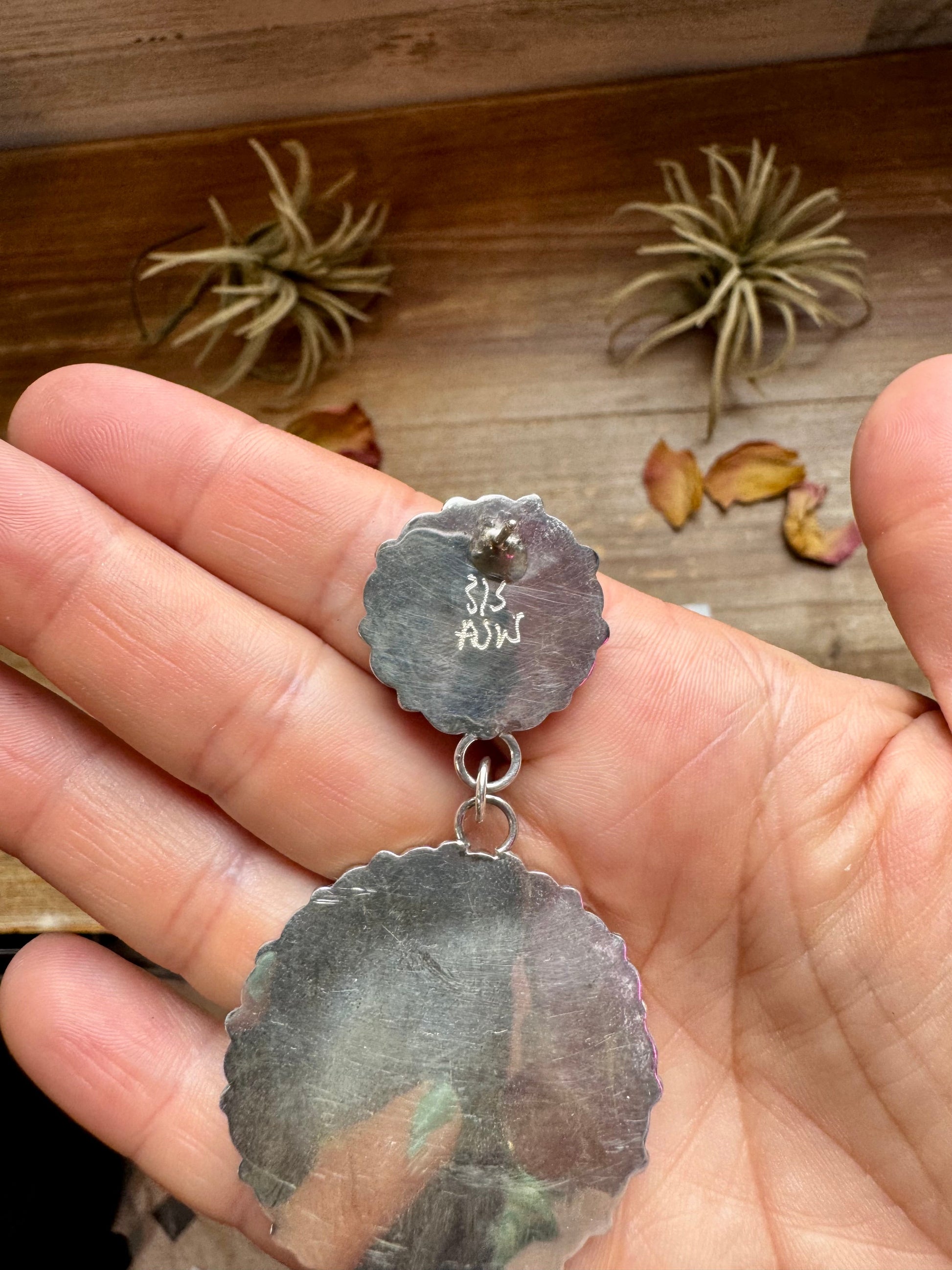 These breathtaking cluster dangle earrings feature genuine Sleeping Beauty turquoise set in solid sterling silver, handcrafted in the USA with post backs placed at the top for a secure, elegant drape. Stamped by the artist (see photo), this pair is truly one of a kind—a collector’s piece and a showstopper.