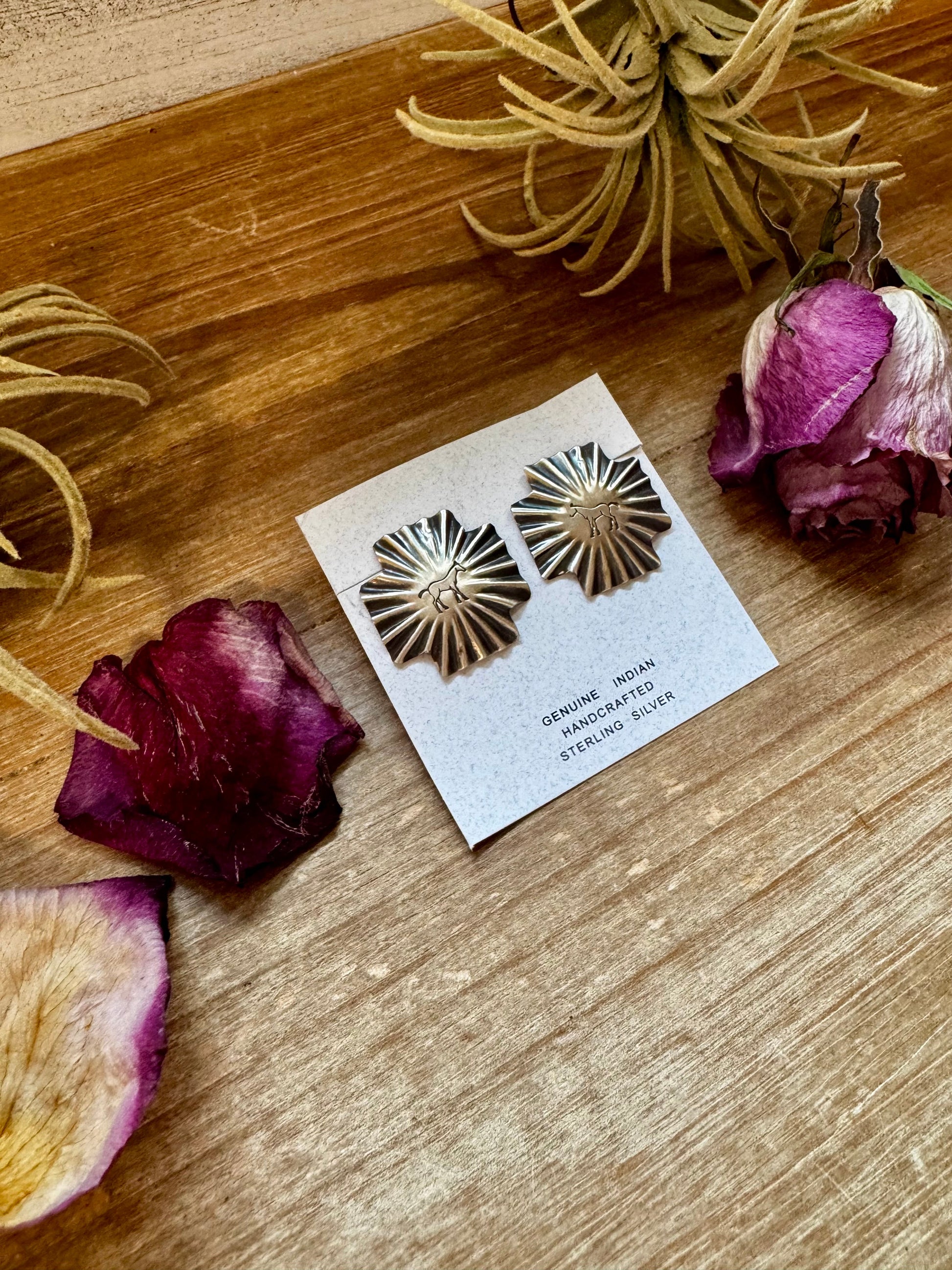 Handmade in sterling silver, these stud earrings are crafted in the shape of a square cross and stamped with a full horse design at the center. Lightweight and comfortable, they’re perfect for everyday wear while adding a distinctive Western flair. The back is stamped for authenticity. Unique silverwork that’s wearable and timeless, made in the USA.