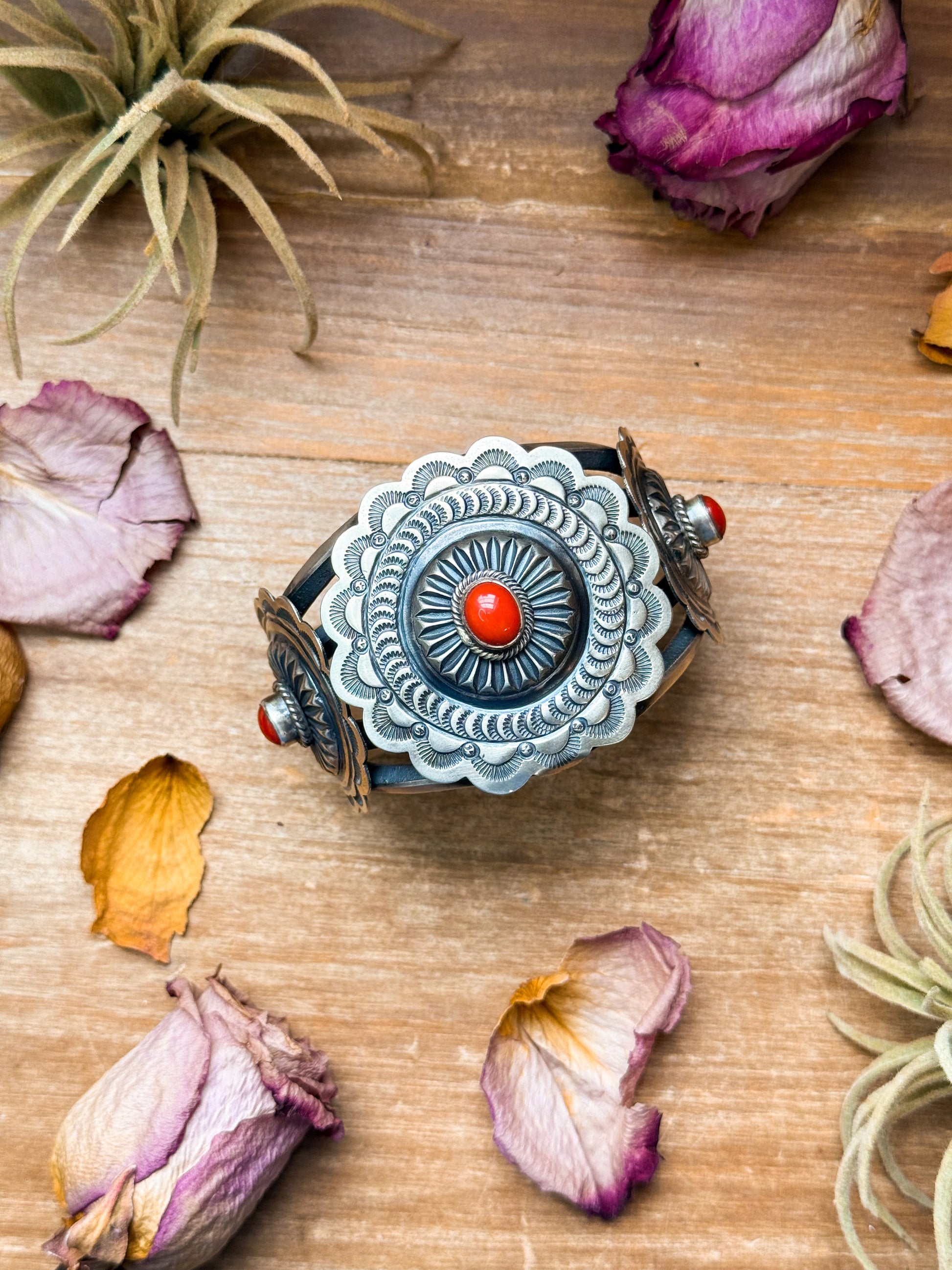 Sterling Silver Coral Jewelry Set – Native Made by Emerson Brown – Cuff, Adjustable Ring & Dangle Earrings