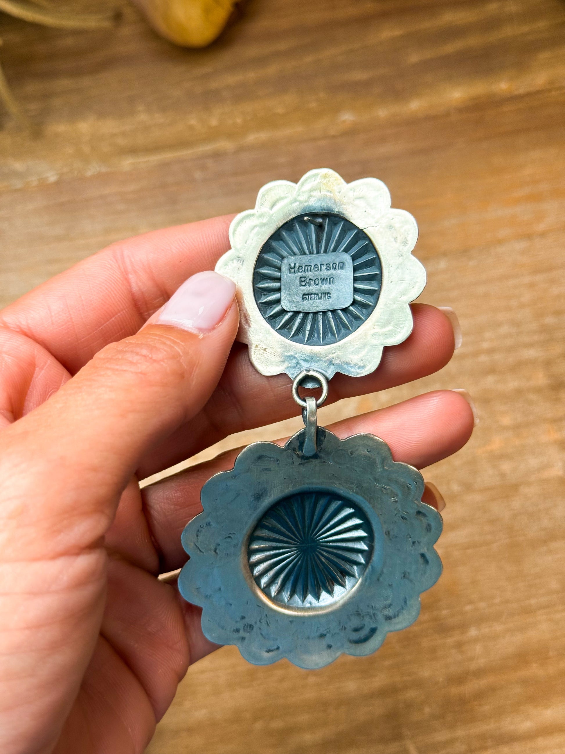 This Native made jewelry set includes a stunning sterling silver cuff, adjustable ring, and matching coral dangle earrings, all handcrafted with care and tradition. The cuff and ring are made by Navajo artist Emerson Brown, featuring genuine coral stones in detailed silver settings. The earrings feature a post-on-top design with dangling coral drops, adding movement and charm. Each piece is stamped “Sterling” and showcases the timeless craftsmanship of Native artistry — a complete, collectible set you’ll treasure forever.