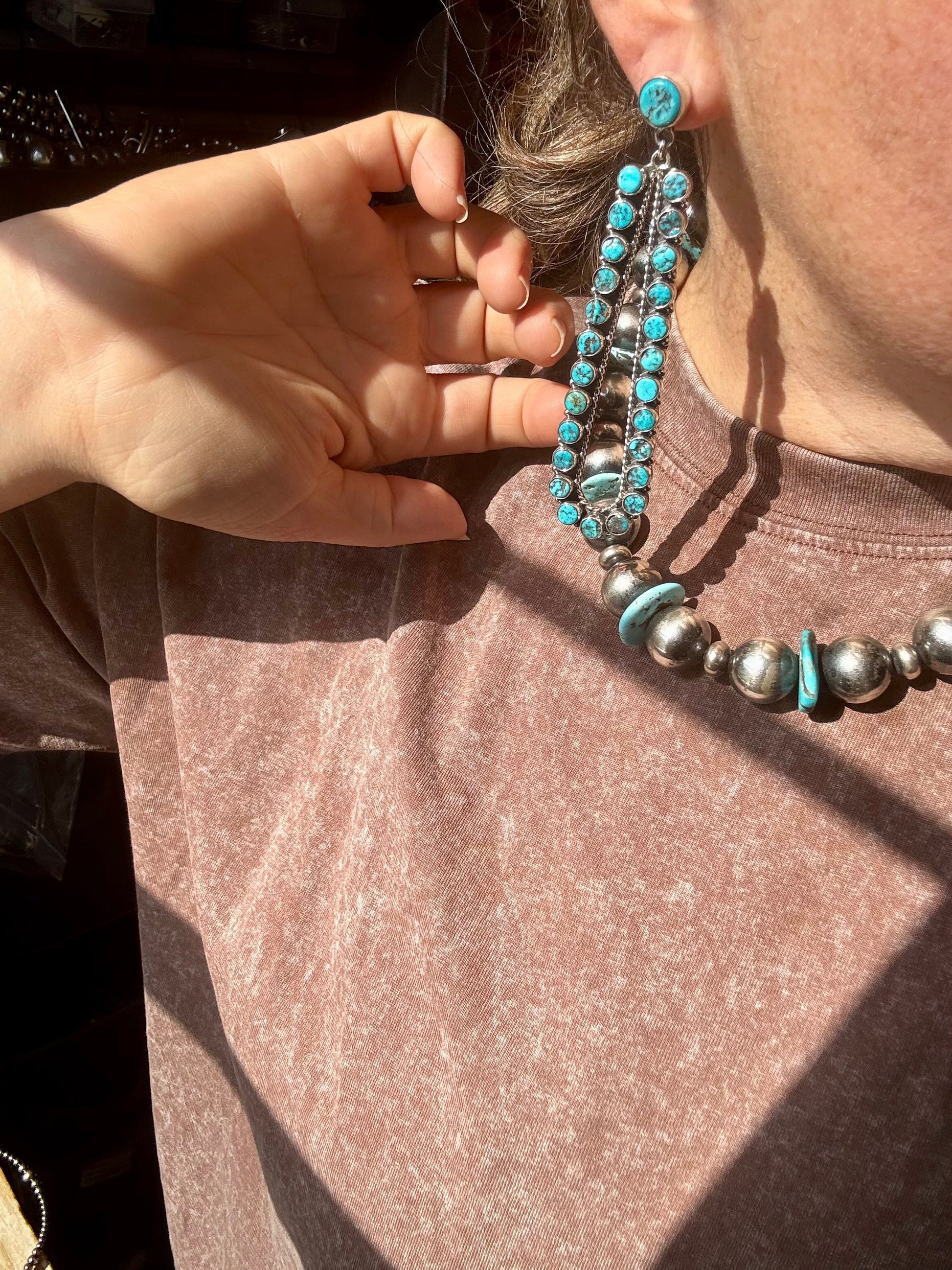 Statement earrings done right. These 4-inch long sterling silver teardrops feature genuine Kingman turquoise at the center of a sleek, elongated design. Set on post backs for secure wear, they’re bold yet refined — and completely unforgettable.