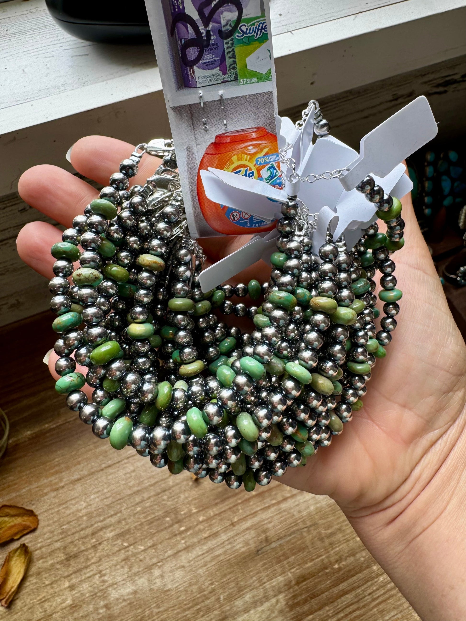 This bracelet is made with 5mm sterling silver pearls and features beautiful 6mm green turquoise rondelle beads. Every turquoise stone is naturally unique in shape and shade. The bracelet measures 6 ½ inches long and comes with a sterling silver extender, lobster clasp, and chain. Lightweight, comfortable, and perfect for layering or wearing solo.